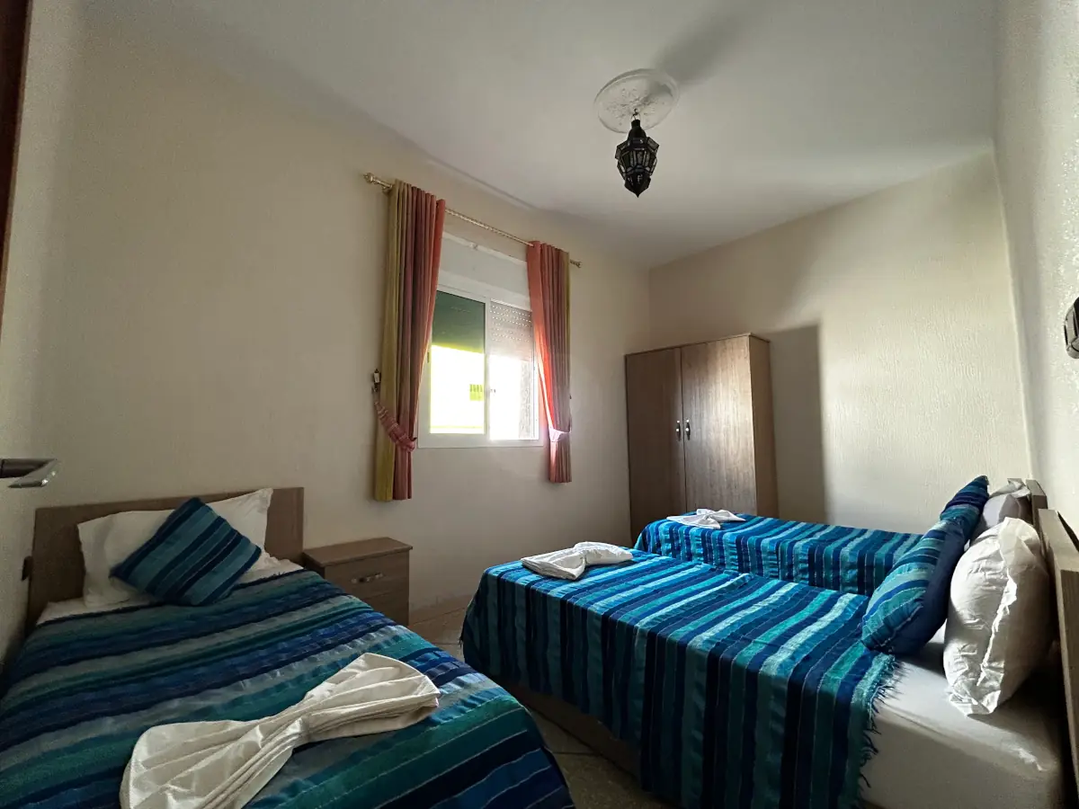 Zwei komfortable Schlafzimmer – eines mit einem französischen Doppelbett, das andere mit drei Einzelbetten – sorgen für erholsame Nächte, während der gemütliche Wohnbereich mit marokkanischem Sofa zum Verweilen einlädt. Eine voll ausgestattete Küche steht dir ebenso zur Verfügung wie ein eigenes Bad mit Dusche. Der private Balkon bietet einen schönen Blick auf den Pool und den Garten. Eine Klimaanlage sorgt für angenehme Temperaturen, während dir Fernseher und kostenfreies WLAN zur Verfügung stehen.